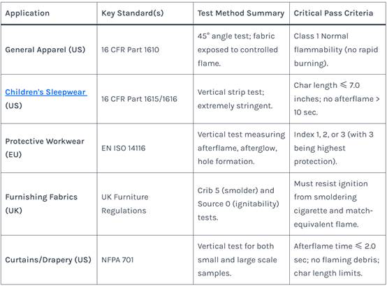 - Apparel: 16 CFR Part 1610 (US CPSC), ISO 15025, EN ISO 14116