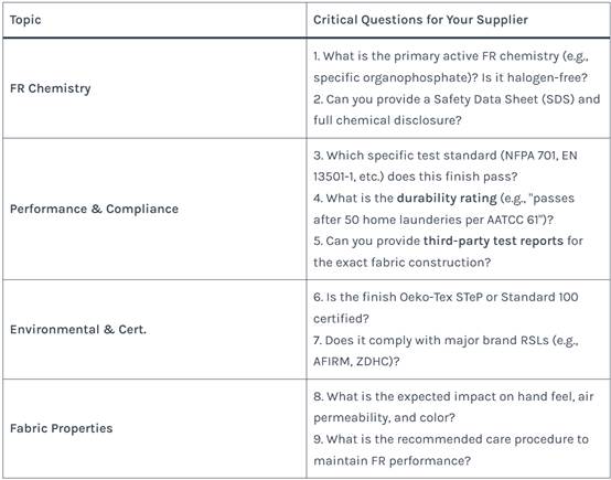 A: Never rely on a certificate alone for a production batch. Implement a batch testing protocol. Require your supplier to provide a third-party lab test report (from an accredited lab like SGS, Bureau Veritas, etc.) for each lot of FR-finished fabric, showing it passes the required standard. Retain reserve samples from each lot for your own due-diligence testing.